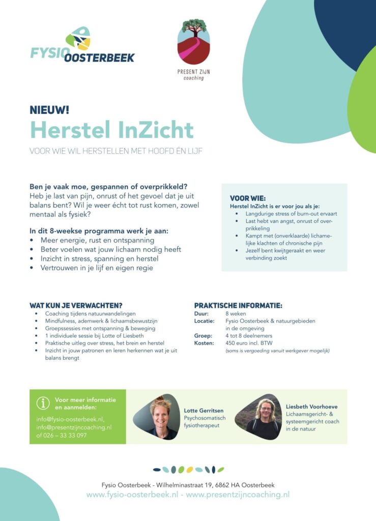 Ben je vaak moe, gespannen of snel overprikkeld? Heb je last van (aanhoudende) pijnklachten, onrust of het gevoel dat je uit balans bent? Het programma Herstel InZicht helpt je om tot rust te komen, jezelf te leren kennen via de signalen van je lijf en de werking van je brein en het autonome zenuwstelsel.